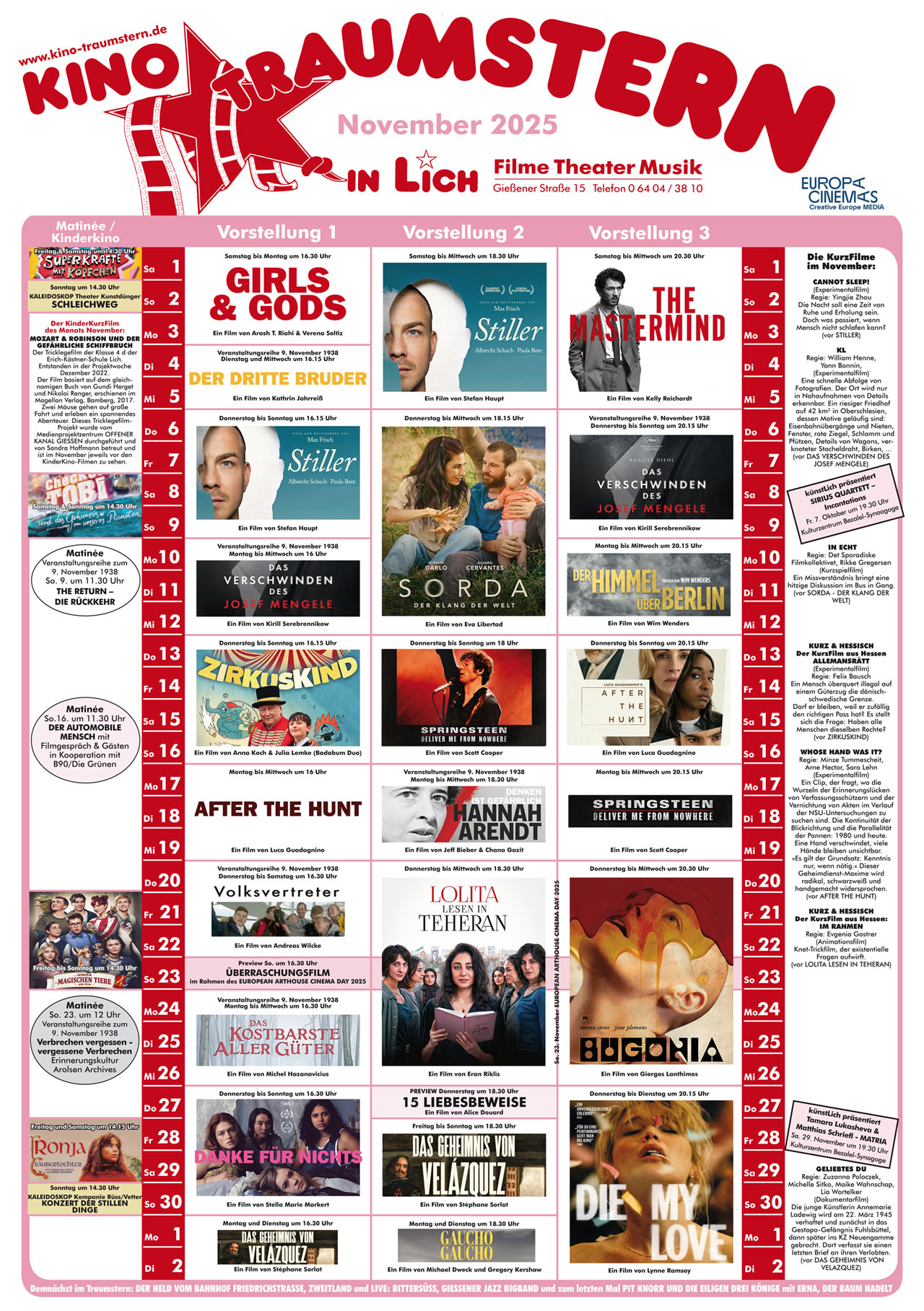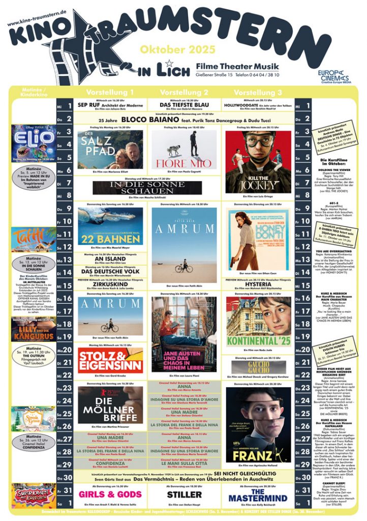 wir haben tolle Veranstaltungen für Sie und Dich – entdecken Sie im Veranstaltungskalender, was künstLich e.V. im Spätsommer und Herbst 2025 bringt. Im Kino Traumstern und im Kulturzentrum Bezalel Synagoge werden viele Konzerte, CD- Vorstellungen, Lesungen, Performances und Filme mit anschließender Diskussion stattfinden.